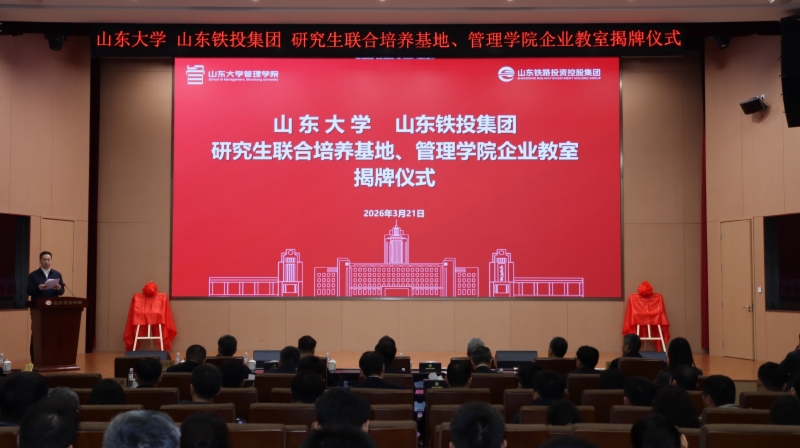 3月21日上午,山东大学、山东铁投集团研究生联合培养基地及管理学院企业教室揭牌仪式在济南举办,旨在深化产教融合、推动校企合作,为协同推进人才培养、科研攻关、成果转化搭建专业平台。山东铁投集团党委书记、董事长王卫中,党委副书记、董事乐江华;山东大学财务部部长路军伟,管理学院党委书记付岩志、院长丁荣贵出席仪式。