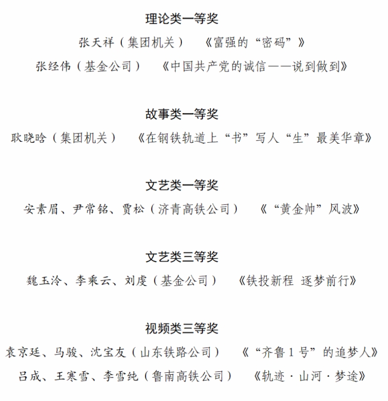 为认真学习贯彻习近平文化思想,贯彻落实《省属国资国企系统践行社会主义核心价值观工作方案》,8月25日至27日,省属企业“我们的价值观 我们的中国梦”百姓宣讲比赛在威海成功举办。山东铁投集团推选的7个作品从省属企业133个作品中脱颖而出,喜获理论类一等奖2项、故事类一等奖1项、文艺类一等奖1项,文艺类三等奖1项,视频类三等奖2项,获奖等次、数量均创新高,展现了集团的风采与实力。