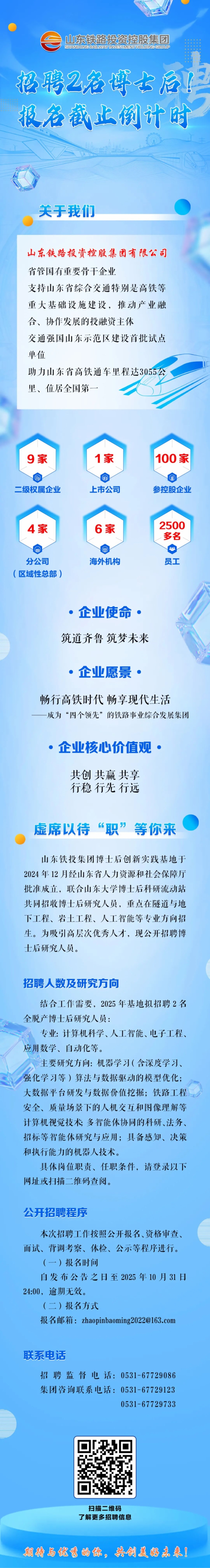 本月底报名截止!山东铁投集团招聘2名博士后研究人员