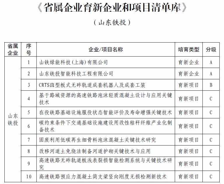此次集团多家单位及项目入选,是省国资委对山东铁投集团创新能力与产业潜力的高度肯定。未来,山东铁投集团将持续聚焦“主业+科创”,以入选的优质育新企业与重点项目为牵引,在铁路智能装备、新能源交通、绿色建造等核心领域持续发力,培育更多具有行业竞争力的新增长点与增长极,以科技创新赋能产业升级,为省属企业高质量发展与交通强国山东示范区建设贡献更多力量。