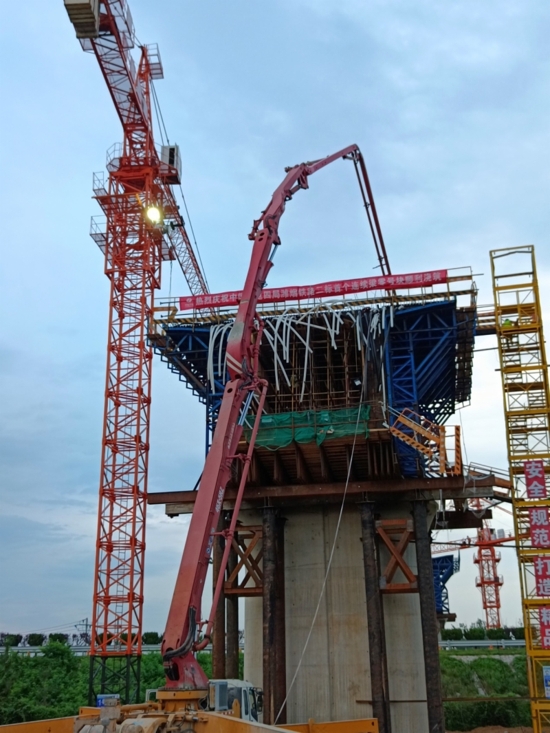 8月5日,潍烟铁路龙家庙村王河特大桥跨疏港高速连续梁零号块顺利浇筑。