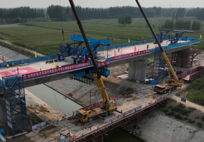 该连续梁位于滨州市滨城区杨柳雪镇,全长113.5米,采用(32+48+32)米连续梁结构。为确保连续梁顺利合龙,山东铁投集团济滨高铁公司和中铁二十四局克服施工环境复杂、环保要求高等难题,精心研究编制专项施工方案,紧盯施工关键环节,现场安排专人对合龙段模板安装、钢筋绑扎、混凝土浇筑等工序进行检查验收,强化现场安全技术保障,选定在凌晨气温低、温差小的时间段进行混凝土浇筑,保证各项控制指标符合规范要求,确保桥梁合龙质量。