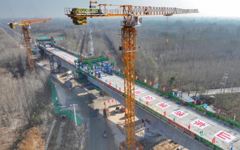 该连续梁位于滨州市惠民县内,为(60+100+60)米连续梁结构,梁宽12.6米,全长221.5米,重1.12万吨,采用挂篮悬臂浇筑法施工,是该标段重点控制性工程。为确保连续梁施工质量和进度,济滨高铁公司和参建单位精心策划,克服上跨施工难度大、技术要求高、质量安全标准严等因素,专题研究编制施工方案,开展专项培训及技术交底,对机械设备调度、交通疏导、安全监督、应急保障措施等工作进行精心部署。强化施工过程控制,安排专人对合龙段钢筋绑扎、劲性骨架锁定、合龙段配重等关键工序进行检查验收,专门选定在气温偏低、温差较小的时间段进行混凝土浇筑,确保桥梁合龙质量达到设计标准。