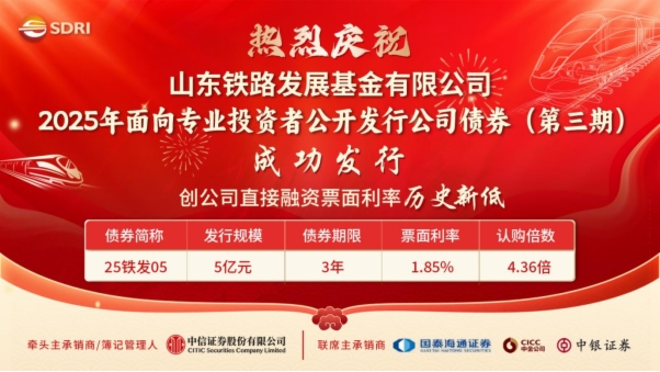 近日,山东铁投集团权属山东铁路发展基金有限公司(以下简称基金公司)成功发行5亿元公司债券,3年期票面利率低至1.85%,认购倍数达4.36倍,创公司直接融资票面利率历史新低。本期债券成功发行,有利于降低铁路发展基金整体融资成本,持续赋能未来业务发展。