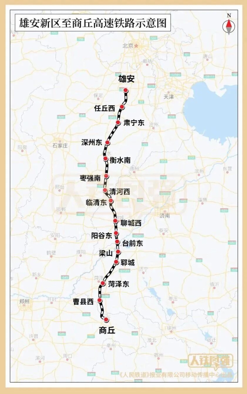 全线设雄安、任丘西、肃宁东、深州东、衡水南、枣强南、清河西、临清东、聊城西、阳谷东、台前东、梁山、郓城、菏泽东、曹县西、商丘16座车站。其中,雄安和菏泽东2座车站为既有车站,梁山、郓城、商丘3座车站为改扩建车站,衡水南等11座车站为新建车站。
