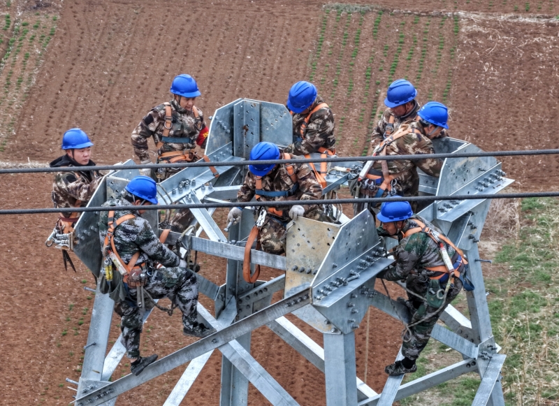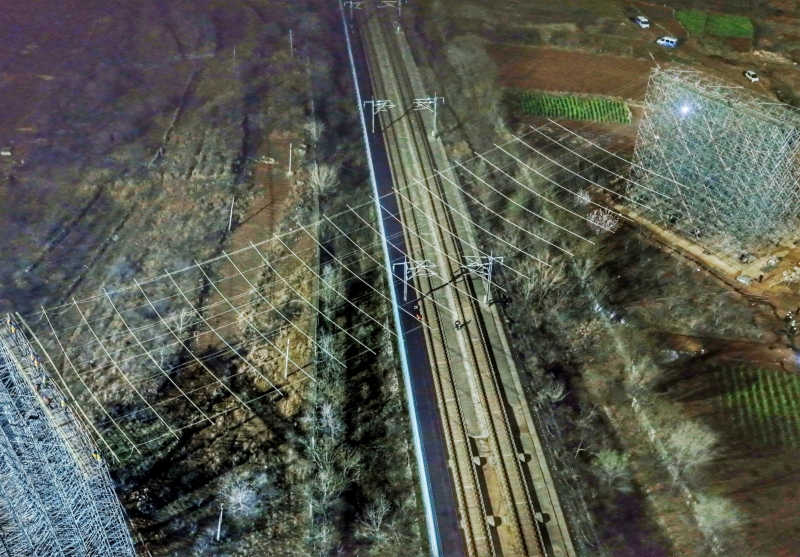 面对工期紧、作业面窄等挑战,项目团队科学组织、高效协同,积极对接国网山东省电力公司、国铁济南局,精准实现铁路天窗点与电力停电计划同步,最大限度争取有效工期、提高施工效率。施工过程中,项目创新采用“耐-直-耐”双回耐张塔架设工艺,大幅提升线路结构稳定性和施工安全性。3月19日至25日,项目顺利完成既有线路防护架搭设、拆网及线路拆旧立新全流程作业。