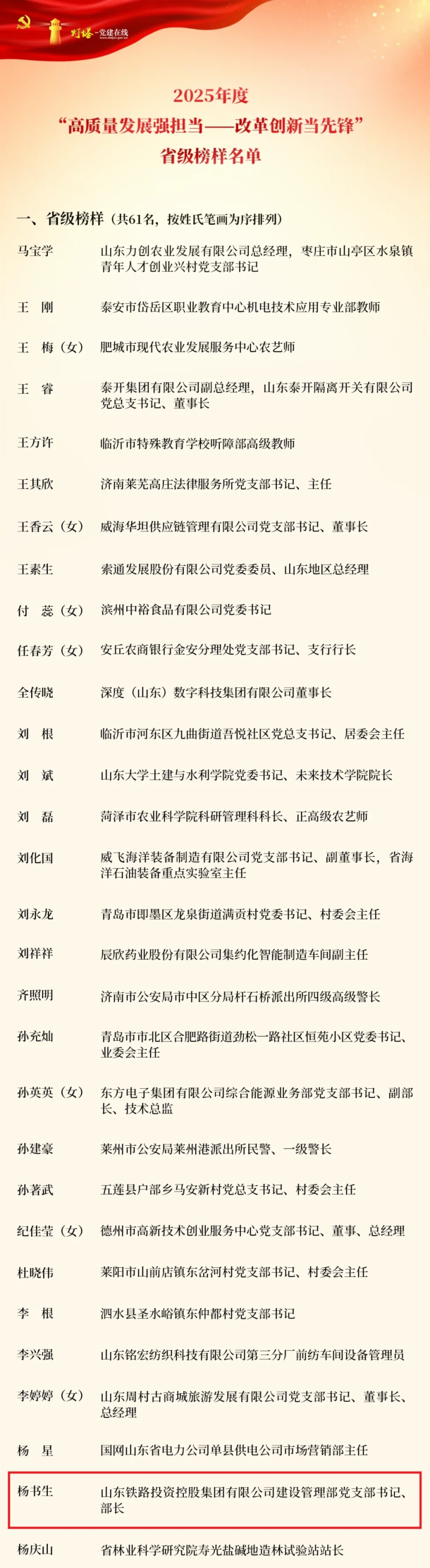 7月11日上午,山东省“齐鲁先锋 榜样有我”榜样讲党课活动在济南举行。现场正式发布2025年度“高质量发展强担当——改革创新当先锋”省级榜样名单。山东铁投集团建设管理部部长杨书生入选。