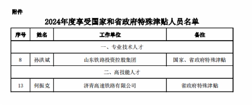 近日,山东省人力资源和社会保障厅公布2024年度享受国家和省政府特殊津贴人员名单,山东铁投集团总经理助理孙洪斌入选享受国家特殊津贴、省政府特殊津贴名单,山东铁投智能科技工程有限公司(申报时就职济青高速铁路有限公司)何振克入选享受省政府特殊津贴名单。